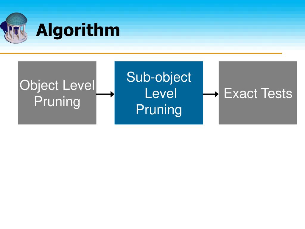 Algorithm Object LevelPruning Sub-object LevelPruning Exact Tests