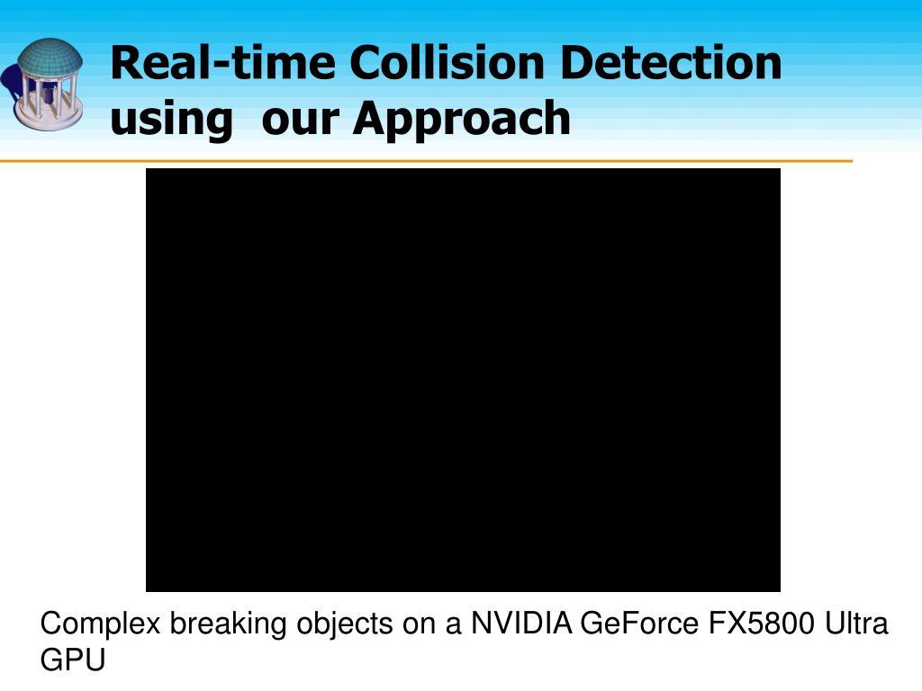 Real-time Collision Detection using our Approach Complex breaking objects on a NVIDIA GeForce FX5800 Ultra GPU