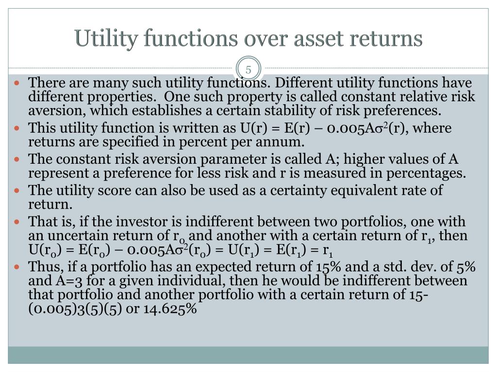 Utility functions over asset returns • There are many such utility functions. Different utility functions have different properties. One such property is called constant relative risk aversion, which establishes a certain stability of risk preferences. • This utility function is written as U(r) = E(r) – 0.005As2(r), where returns are specified in percent per annum. • The constant risk aversion parameter is called A; higher values of A represent a preference for less riskand r is measured in percentages. • The utility score can also be used as a certainty equivalent rate of return. • That is, if the investor is indifferent between two portfolios, one with an uncertain return of r0 and another with a certain return of r1, thenU(r0) = E(r0) – 0.005As2(r0) = U(r1) = E(r1) = r1 • Thus, if a portfolio has an expected return of 15% and a std. dev. of 5% and A=3 for a given individual, then he would be indifferent between that portfolio and another portfolio with a certain return of 15-(0.005)3(5)(5) or 14.625%