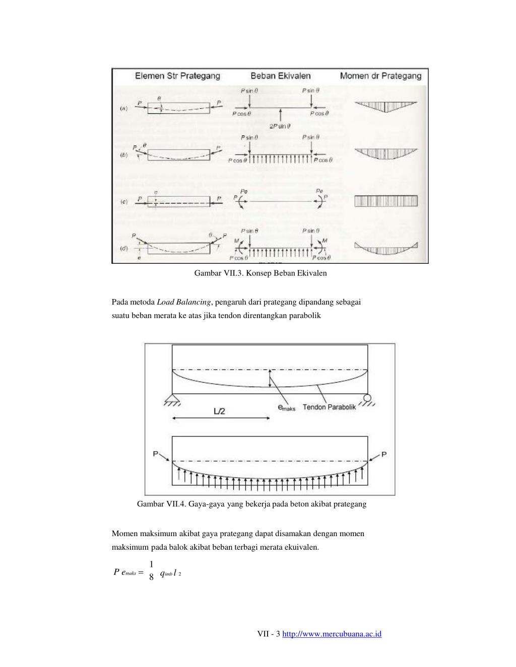 Gambar VII.3. Konsep Beban Ekivalen Pada metoda Load Balancing, pengaruh dari prategang dipandang sebagai suatu beban merata ke atas jika tendon direntangkan parabolik Gambar VII.4. Gaya-gaya yang bekerja pada beton akibat prategang Momen maksimum akibat gaya prategang dapat disamakan dengan momen maksimum pada balok akibat beban terbagi merata ekuivalen. 1 8 P emaks qimb l 2 VII - 3 http://www.mercubuana.ac.id