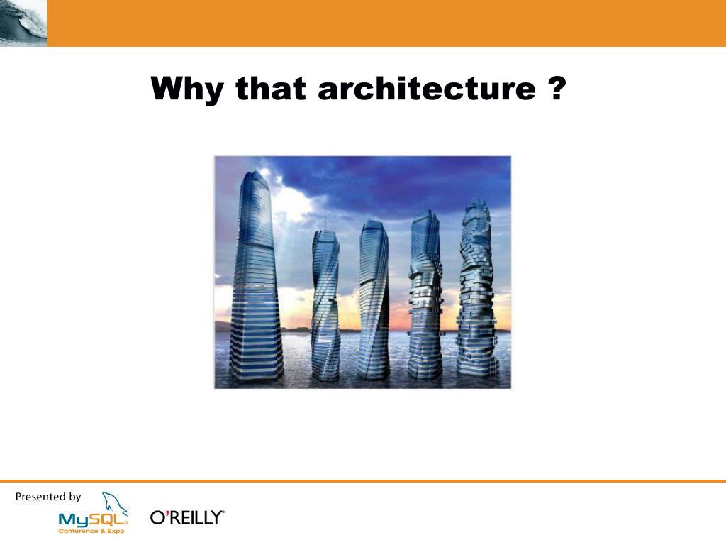 Why that architecture ? • We had an idea ….. • We validated the idea through benchmark results and analysis • We analyzed several MySQL Storage engines (MyISAM, InnoDB, Maria, PBXT, Falcon) on 4 types of filesystems (Ext3, JFS, XFS, ReiserFS) using two system architectures (AMD and Intel), two types of data device technologies and integrated the benchmarks with some specific low-level optimizations.