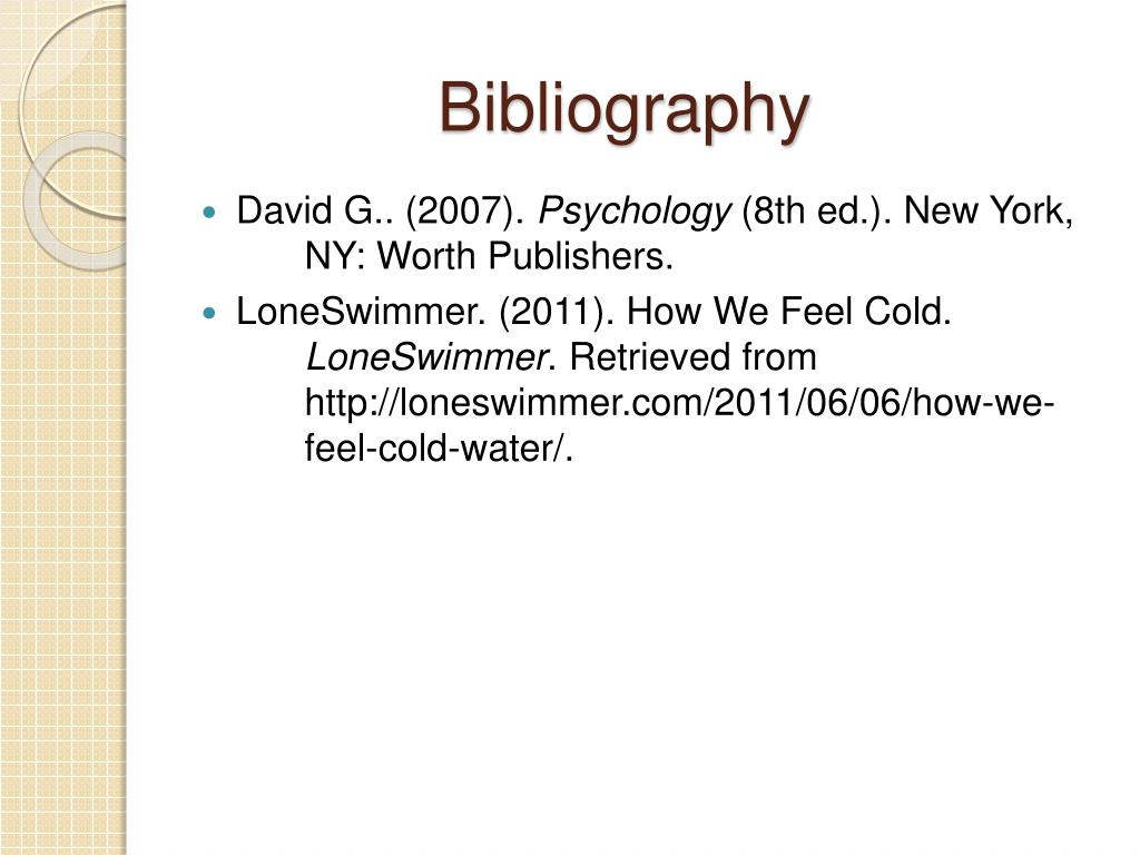 Bibliography • David G.. (2007). Psychology (8th ed.). New York, NY: Worth Publishers. • LoneSwimmer. (2011). How We Feel Cold. LoneSwimmer. Retrieved from http://loneswimmer.com/2011/06/06/how-we- feel-cold-water/.