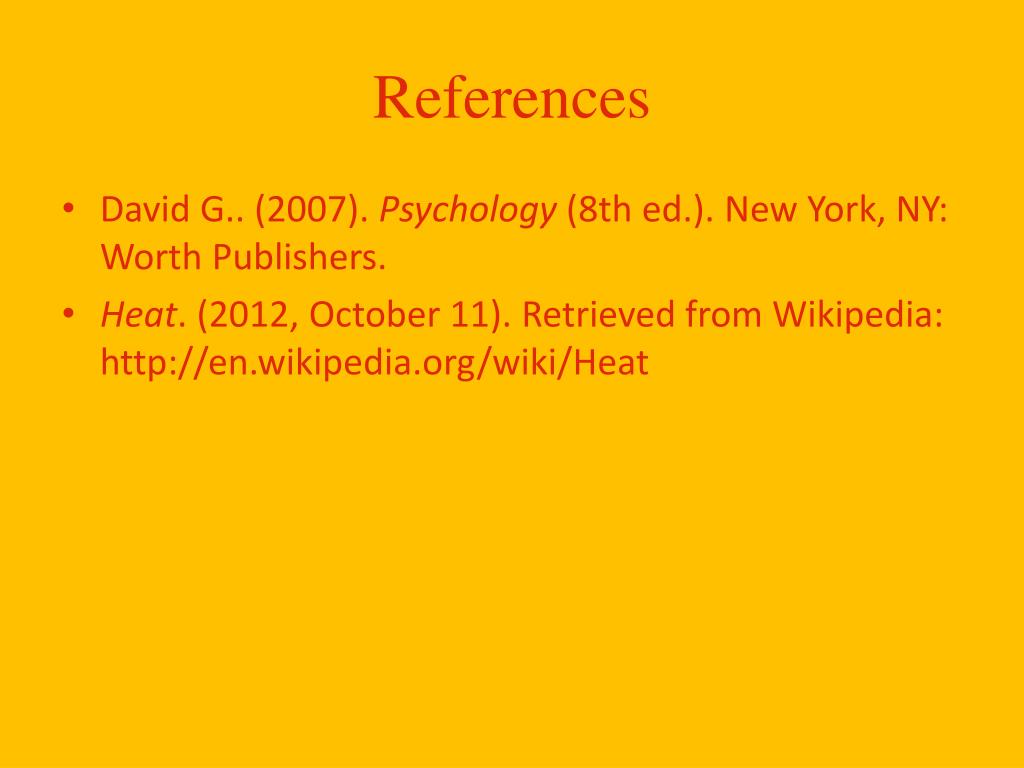 References • David G.. (2007). Psychology (8th ed.). New York, NY: Worth Publishers. • Heat. (2012, October 11). Retrieved from Wikipedia: http://en.wikipedia.org/wiki/Heat