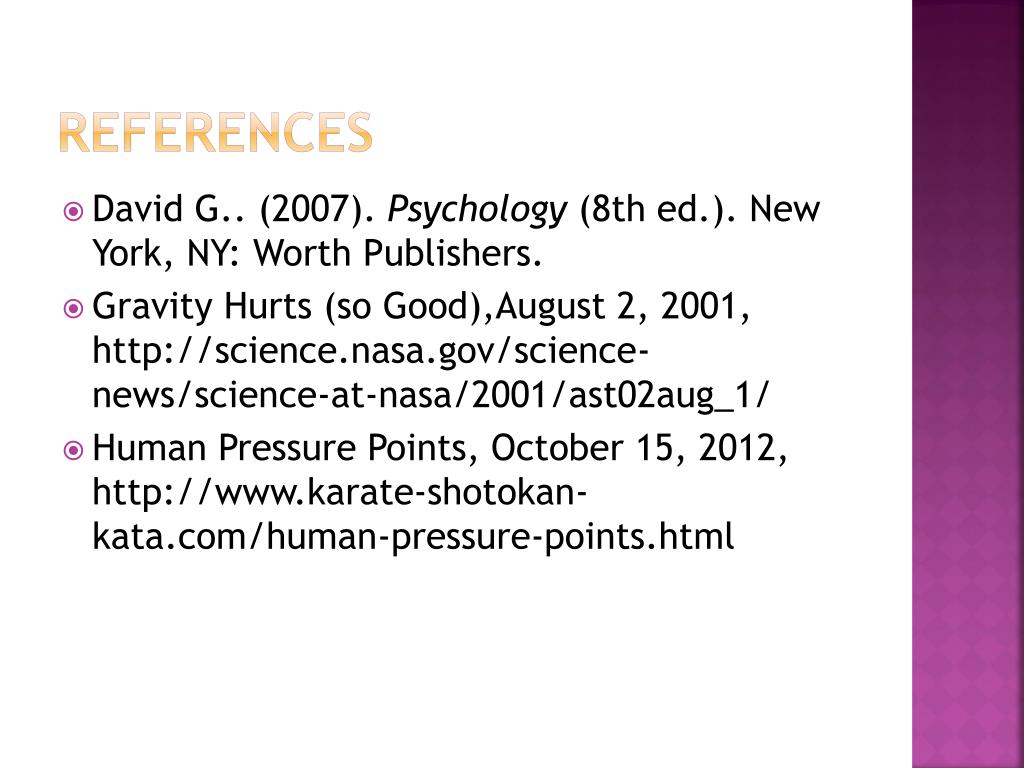 References • David G.. (2007). Psychology (8th ed.). New York, NY: Worth Publishers. • Gravity Hurts (so Good),August 2, 2001, http://science.nasa.gov/science-news/science-at-nasa/2001/ast02aug_1/ • Human Pressure Points, October 15, 2012, http://www.karate-shotokan-kata.com/human-pressure-points.html