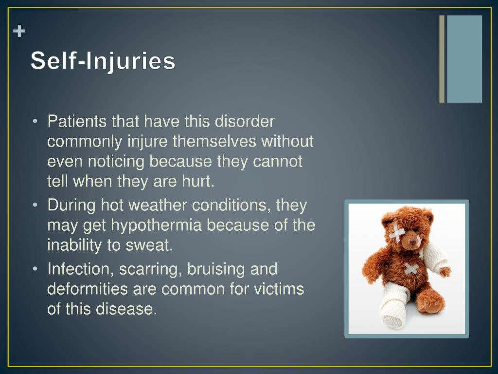 Self-Injuries • Patients that have this disorder commonly injure themselves without even noticing because they cannot tell when they are hurt. • During hot weather conditions, they may get hypothermia because of the inability to sweat. • Infection, scarring, bruising and deformities are common for victims of this disease.
