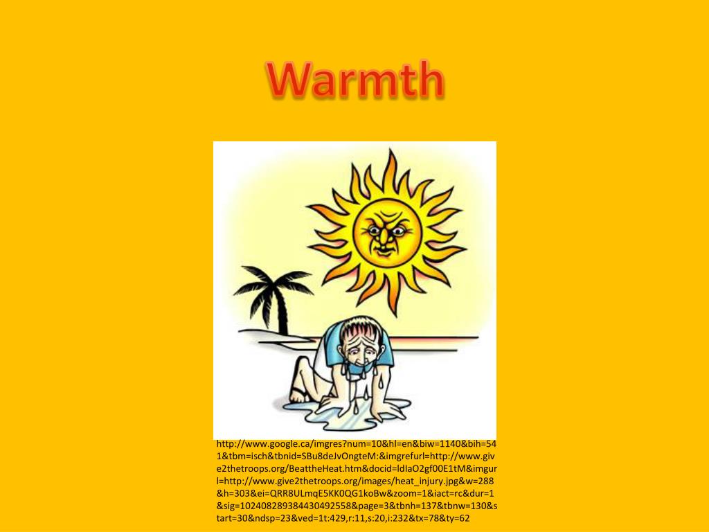 Warmth http://www.google.ca/imgres?num=10&hl=en&biw=1140&bih=541&tbm=isch&tbnid=SBu8deJvOngteM:&imgrefurl=http://www.give2thetroops.org/BeattheHeat.htm&docid=ldIaO2gf00E1tM&imgurl=http://www.give2thetroops.org/images/heat_injury.jpg&w=288&h=303&ei=QRR8ULmqE5KK0QG1koBw&zoom=1&iact=rc&dur=1&sig=102408289384430492558&page=3&tbnh=137&tbnw=130&start=30&ndsp=23&ved=1t:429,r:11,s:20,i:232&tx=78&ty=62