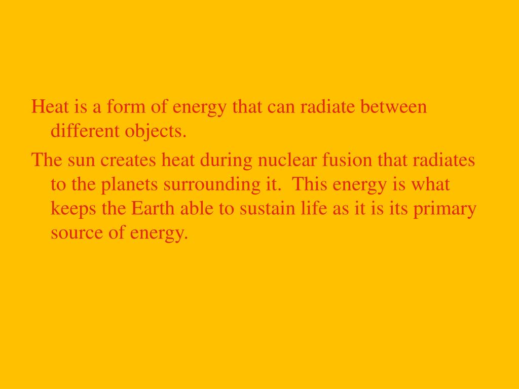 Heat is a form of energy that can radiate between different objects. The sun creates heat during nuclear fusion that radiates to the planets surrounding it. This energy is what keeps the Earth able to sustain life as it is its primary source of energy.