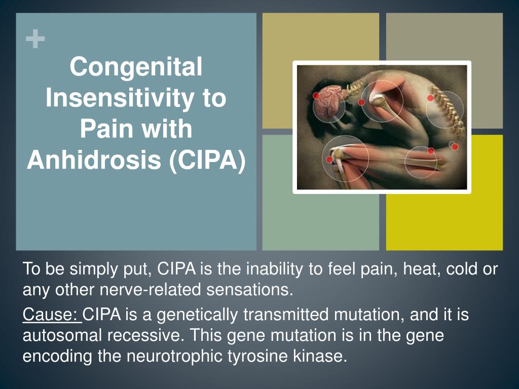 Congenital Insensitivity to Pain with Anhidrosis (CIPA) To be simply put, CIPA is the inability to feel pain, heat, cold or any other nerve-related sensations. Cause: CIPA is a genetically transmitted mutation, and it is autosomal recessive. This gene mutation is in the gene encoding the neurotrophic tyrosine kinase.