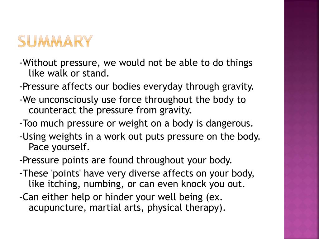summary -Without pressure, we would not be able to do things like walk or stand. -Pressure affects our bodies everyday through gravity. -We unconsciously use force throughout the body to counteract the pressure from gravity. -Too much pressure or weight on a body is dangerous. -Using weights in a work out puts pressure on the body. Pace yourself. -Pressure points are found throughout your body. -These 'points' have very diverse affects on your body, like itching, numbing, or can even knock you out. -Can either help or hinder your well being (ex. acupuncture, martial arts, physical therapy).