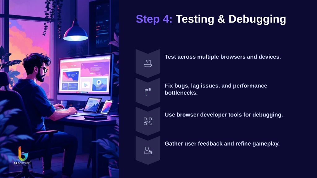 Step 4: Testing & Debugging Test across multiple browsers and devices. Fix bugs, lag issues, and performance bottlenecks. Use browser developer tools for debugging. Gather user feedback and refine gameplay.