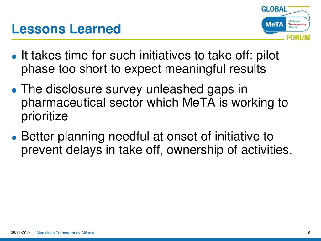 Lessons Learned It takes time for such initiatives to take off: pilot phase too short to expect meaningful results The disclosure survey unleashed gaps in pharmaceutical sector which MeTA is working to prioritize Better planning needful at onset of initiative to prevent delays in take off, ownership of activities.
