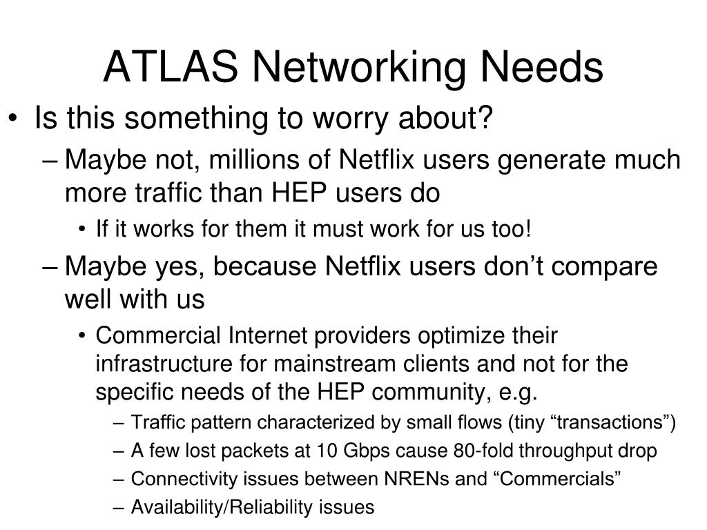 ATLAS Networking Needs • Is this something to worry about? • Maybe not, millions of Netflix users generate much more traffic than HEP users do • If it works for them it must work for us too! • Maybe yes, because Netflix users don’t compare well with us • Commercial Internet providers optimize their infrastructure for mainstream clients and not for the specific needs of the HEP community, e.g. • Traffic pattern characterized by small flows (tiny “transactions”) • A few lost packets at 10 Gbps cause 80-fold throughput drop • Connectivity issues between NRENs and “Commercials” • Availability/Reliability issues
