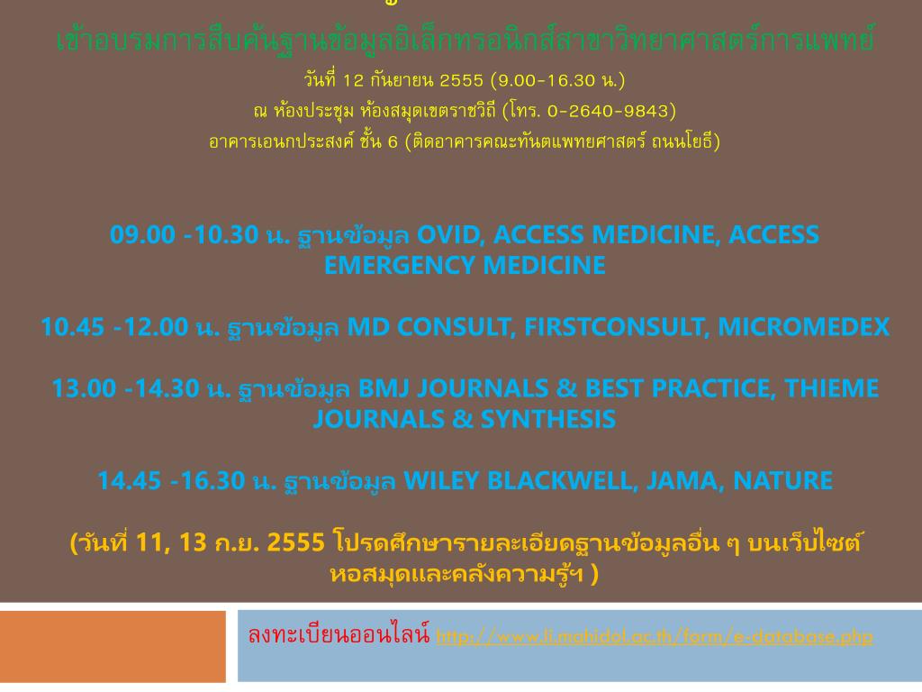 ขอเรียนเชิญอาจารย์และนักศึกษาเข้าอบรมการสืบค้นฐานข้อมูลอิเล็กทรอนิกส์สาขาวิทยาศาสตร์การแพทย์วันที่ 12 กันยายน 2555 (9.00-16.30 น.)ณ ห้องประชุม ห้องสมุดเขตราชวิถี (โทร. 0-2640-9843)อาคารเอนกประสงค์ ชั้น 6 (ติดอาคารคณะทันตแพทยศาสตร์ ถนนโยธี)09.00 -10.30 น. ฐานข้อมูล OVID, Access Medicine, Access Emergency Medicine 10.45 -12.00 น. ฐานข้อมูล MD Consult, FirstConsult, Micromedex13.00 -14.30 น. ฐานข้อมูล BMJ Journals & Best Practice, Thieme Journals & Synthesis 14.45 -16.30 น. ฐานข้อมูล Wiley Blackwell, JAMA, Nature(วันที่ 11, 13 ก.ย. 2555 โปรดศึกษารายละเอียดฐานข้อมูลอื่น ๆ บนเว็บไซต์หอสมุดและคลังความรู้ฯ ) ลงทะเบียนออนไลน์ http://www.li.mahidol.ac.th/form/e-database.php