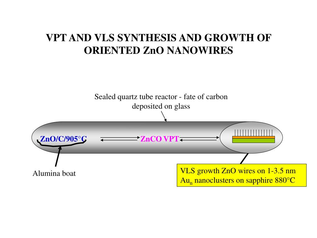 ZnO/C/905°C ZnCOVPT VPT AND VLS SYNTHESIS AND GROWTH OF ORIENTED ZnO NANOWIRES Sealed quartz tube reactor - fate of carbon deposited on glass VLS growth ZnO wires on 1-3.5 nm Aun nanoclusters on sapphire 880°C Alumina boat