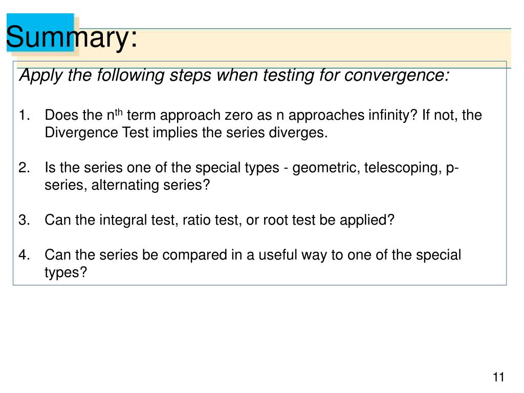 Summary: • Apply the following steps when testing for convergence: • Does the nth term approach zero as n approaches infinity? If not, the Divergence Test implies the series diverges. • Is the series one of the special types - geometric, telescoping, p-series, alternating series? • Can the integral test, ratio test, or root test be applied? • Can the series be compared in a useful way to one of the special types?