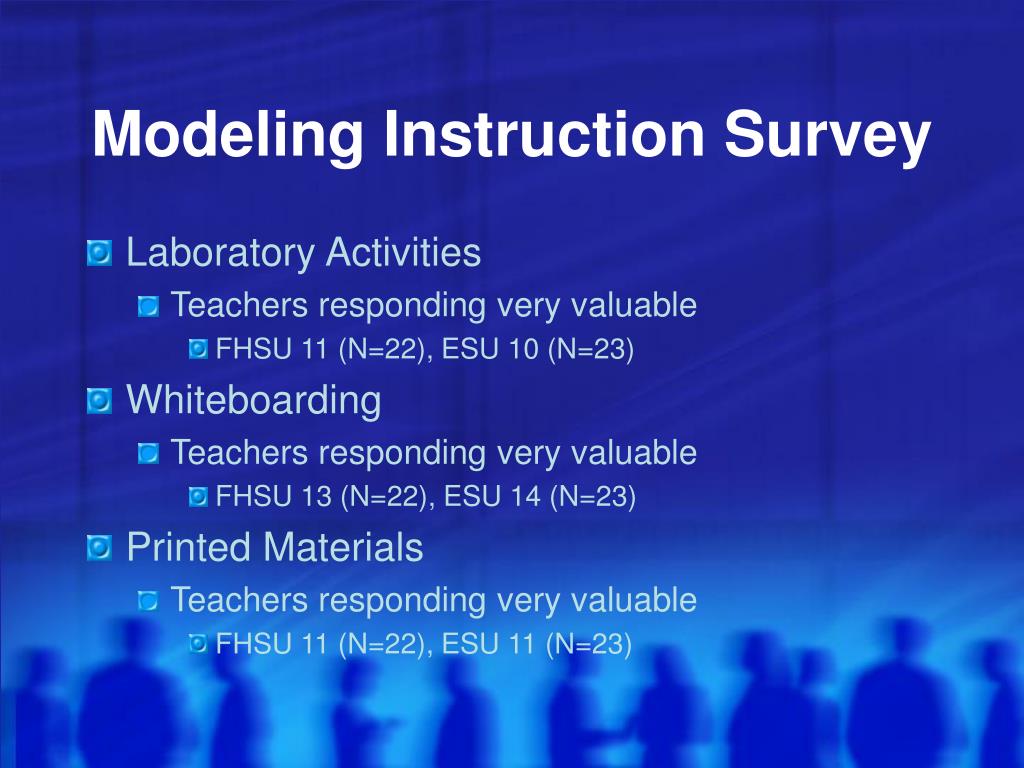 Modeling Instruction Survey • Laboratory Activities • Teachers responding very valuable • FHSU 11 (N=22), ESU 10 (N=23) • Whiteboarding • Teachers responding very valuable • FHSU 13 (N=22), ESU 14 (N=23) • Printed Materials • Teachers responding very valuable • FHSU 11 (N=22), ESU 11 (N=23)