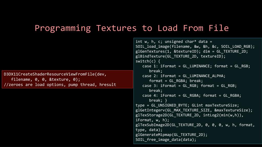 Programming Textures to Load From File int w, h, c; unsigned char* data = SOIL_load_image(filename, &w, &h, &c, SOIL_LOAD_RGB); glGenTextures(1, &textureID); dim = GL_TEXTURE_2D; glBindTexture(GL_TEXTURE_2D, textureID); switch(c) { case 1: iFormat= GL_LUMINANCE; format = GL_RGB; break; case 2: iFormat= GL_LUMINANCE_ALPHA; format = GL_RGBA; break; case 3: iFormat= GL_RGB; format = GL_RGB; break; case 4: iFormat= GL_RGBA; format = GL_RGBA; break; } type = GL_UNSIGNED_BYTE; GLintmaxTextureSize; glGetIntegerv(GL_MAX_TEXTURE_SIZE, &maxTextureSize); glTexStorage2D(GL_TEXTURE_2D, intLog2(min(w,h)), iFormat, w, h); glTexSubImage2D(GL_TEXTURE_2D, 0, 0, 0, w, h, format, type, data); glGenerateMipmap(GL_TEXTURE_2D); SOIL_free_image_data(data); D3DX11CreateShaderResourceViewFromFile(dev, filename, 0, 0, &texture, 0); //zeroes are load options, pump thread, hresult