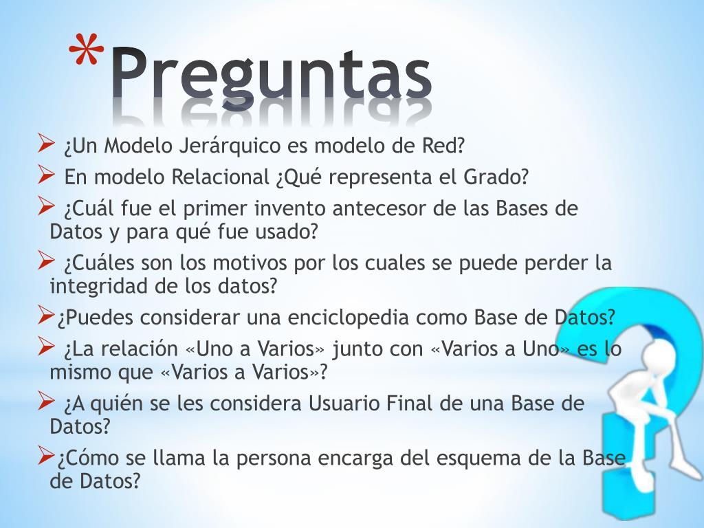 ¿Un Modelo Jerárquico es modelo de Red? • En modelo Relacional ¿Qué representa el Grado? • ¿Cuál fue el primer invento antecesor de las Bases de Datos y para qué fue usado? • ¿Cuáles son los motivos por los cuales se puede perder la integridad de los datos? • ¿Puedes considerar una enciclopedia como Base de Datos? • ¿La relación «Uno a Varios» junto con «Varios a Uno» es lo mismo que «Varios a Varios»? • ¿A quién se les considera Usuario Final de una Base de Datos? • ¿Cómo se llama la persona encarga del esquema de la Base de Datos? Preguntas