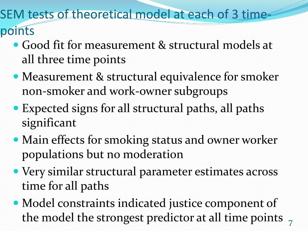 SEM tests of theoretical model at each of 3 time-points • Good fit for measurement & structural models at all three time points • Measurement & structural equivalence for smoker non-smoker and work-owner subgroups • Expected signs for all structural paths, all paths significant • Main effects for smoking status and owner worker populations but no moderation • Very similar structural parameter estimates across time for all paths • Model constraints indicated justice component of the model the strongest predictor at all time points