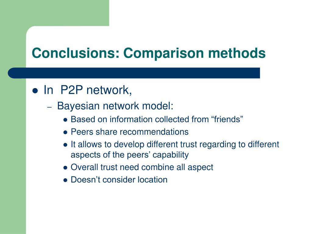 Conclusions: Comparison methods • In P2P network, • Bayesian network model: • Based on information collected from “friends” • Peers share recommendations • It allows to develop different trust regarding to different aspects of the peers’ capability • Overall trust need combine all aspect • Doesn’t consider location