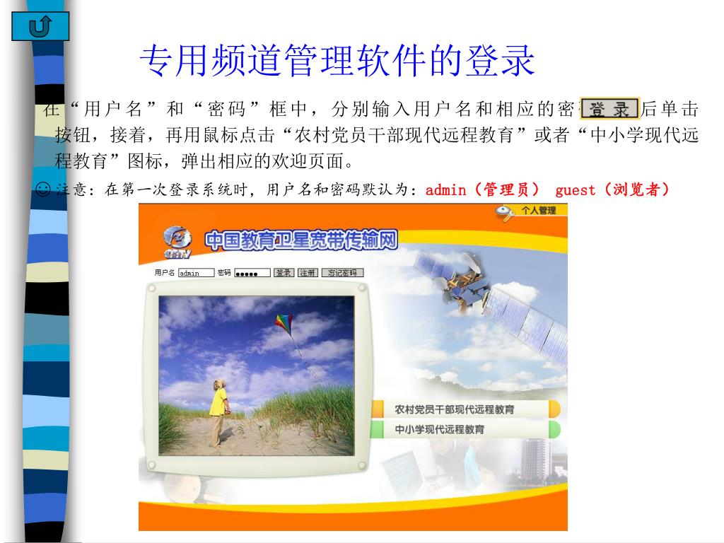 专用频道管理软件的登录 在“用户名”和“密码”框中,分别输入用户名和相应的密码;然后单击 按钮,接着,再用鼠标点击“农村党员干部现代远程教育”或者“中小学现代远程教育”图标,弹出相应的欢迎页面。 ☺ 注意:在第一次登录系统时,用户名和密码默认为:admin(管理员)guest(浏览者)
