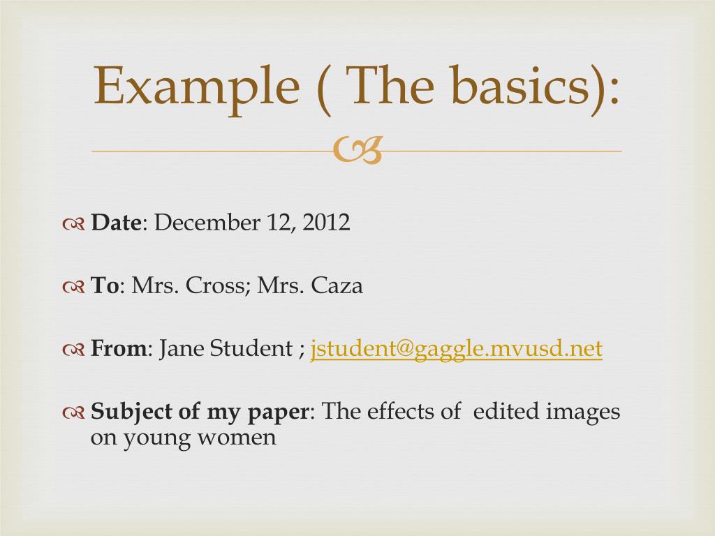 Example ( The basics): • Date: December 12, 2012 • To: Mrs. Cross; Mrs. Caza • From: Jane Student ; jstudent@gaggle.mvusd.net • Subject of my paper: The effects of edited images on young women