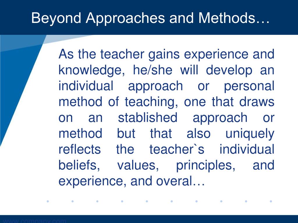 Beyond Approaches and Methods… As the teacher gains experience and knowledge, he/she will develop an individual approach or personal method of teaching, one that draws on an stablished approach or method but that also uniquely reflects the teacher`s individual beliefs, values, principles, and experience, and overal…