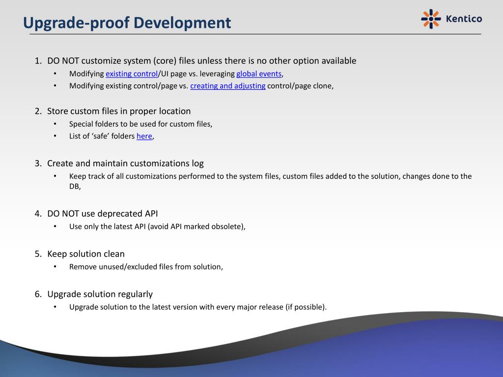 Upgrade-proof Development • DO NOT customize system (core) files unless there is no other option available • Modifying existing control/UI page vs. leveraging global events, • Modifying existing control/page vs. creating and adjusting control/page clone, • Store custom files in proper location • Special folders to be used for custom files, • List of ‘safe’ folders here, • Create and maintain customizations log • Keep track of all customizations performed to the system files, custom files added to the solution, changes done to the DB, • DO NOT use deprecated API • Use only the latest API (avoid API marked obsolete), • Keep solution clean • Remove unused/excluded files from solution, • Upgrade solution regularly • Upgrade solution to the latest version with every major release (if possible).