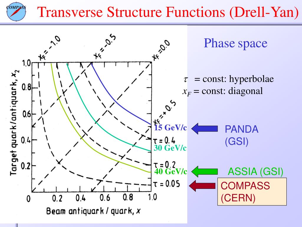Transverse Structure Functions (Drell-Yan) Phasespace = const: hyperbolae xF = const: diagonal COMPASS - Future Physics 15 GeV/c PANDA (GSI) 30 GeV/c ASSIA (GSI) 40 GeV/c COMPASS (CERN)