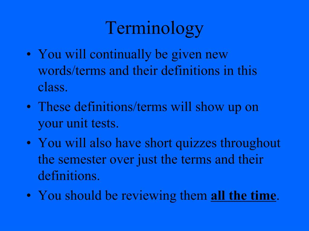 Terminology • You will continually be given new words/terms and their definitions in this class. • These definitions/terms will show up on your unit tests. • You will also have short quizzes throughout the semester over just the terms and their definitions. • You should be reviewing them all the time.