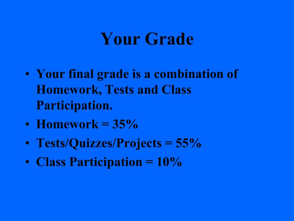 Your Grade • Your final grade is a combination of Homework, Tests and Class Participation. • Homework = 35% • Tests/Quizzes/Projects = 55% • Class Participation = 10%
