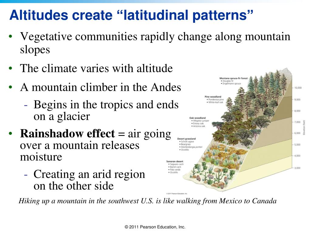 Altitudes create “latitudinal patterns” • Vegetative communities rapidly change along mountain slopes • The climate varies with altitude • A mountain climber in the Andes • Begins in the tropics and ends on a glacier • Rainshadow effect= air going over a mountain releases moisture • Creating an arid region on the other side • Hiking up a mountain in the southwest U.S. is like walking from Mexico to Canada