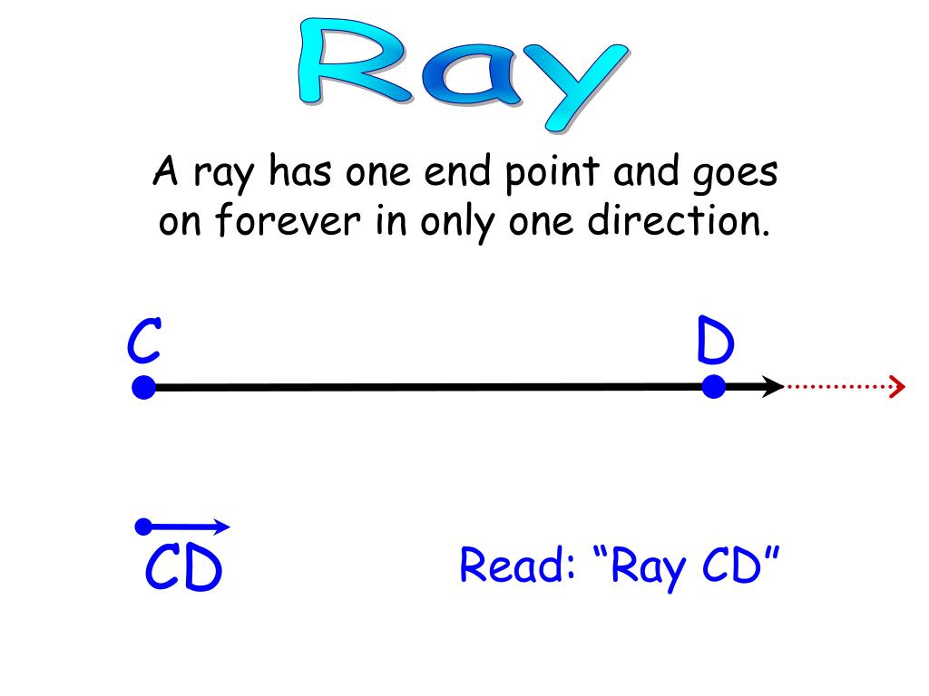 Ray A ray has one end point and goes on forever in only one direction. D C CD Read: “Ray CD”