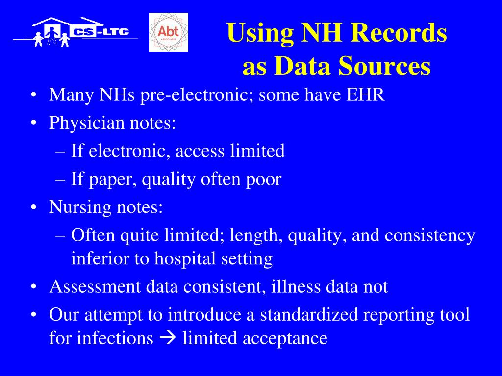 Using NH Records as Data Sources • Many NHs pre-electronic; some have EHR • Physician notes: • If electronic, access limited • If paper, quality often poor • Nursing notes: • Often quite limited; length, quality, and consistency inferior to hospital setting • Assessment data consistent, illness data not • Our attempt to introduce a standardized reporting tool for infections limited acceptance