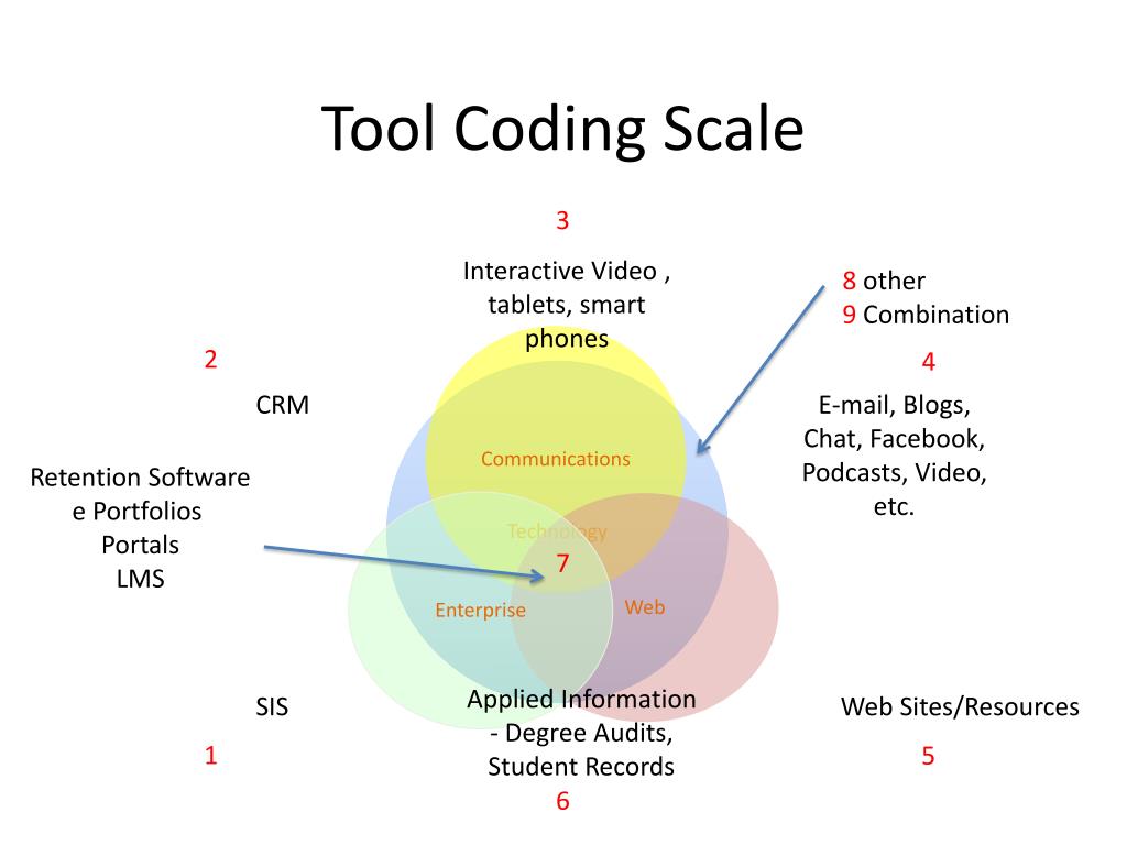 Tool Coding Scale 3 Interactive Video , tablets, smart phones 8 other 9 Combination 2 4 CRM E-mail, Blogs, Chat, Facebook, Podcasts, Video, etc. Retention Software e Portfolios Portals LMS 7 Applied Information - Degree Audits, Student Records SIS Web Sites/Resources 1 5 6