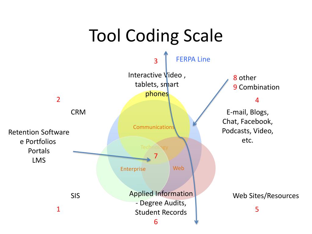 Tool Coding Scale FERPA Line 3 Interactive Video , tablets, smart phones 8 other 9 Combination 2 4 CRM E-mail, Blogs, Chat, Facebook, Podcasts, Video, etc. Retention Software e Portfolios Portals LMS 7 Applied Information - Degree Audits, Student Records SIS Web Sites/Resources 1 5 6