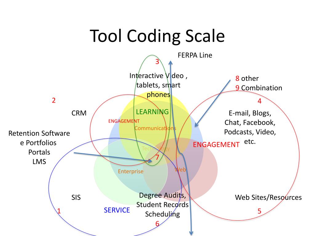 Tool Coding Scale FERPA Line 3 Interactive Video , tablets, smart phones 8 other 9 Combination 2 4 LEARNING CRM E-mail, Blogs, Chat, Facebook, Podcasts, Video, etc. ENGAGEMENT Retention Software e Portfolios Portals LMS ENGAGEMENT 7 Degree Audits, Student Records Scheduling SIS Web Sites/Resources SERVICE 1 5 6
