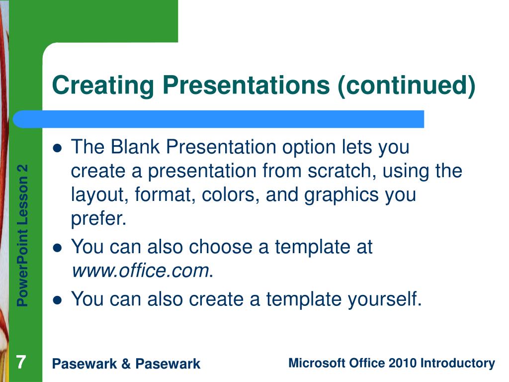 To create your presentation, you can Start with a blank presentation. Use slides from an existing presentation. Use a template. Create a presentation from an existing theme. A template is simply a presentation that includes theme elements, text, and graphics predesigned for a presentation. Creating Presentations 5 5