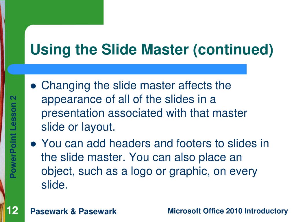 PowerPoint Lesson 2 Creating and Enhancing PowerPoint Presentations. Microsoft Office 2010 Introductory. Pasewark & Pasewark. Objectives. Create presentations and add slides. Insert headers and footers. Use the Slide Master and the Notes and Handout Master.