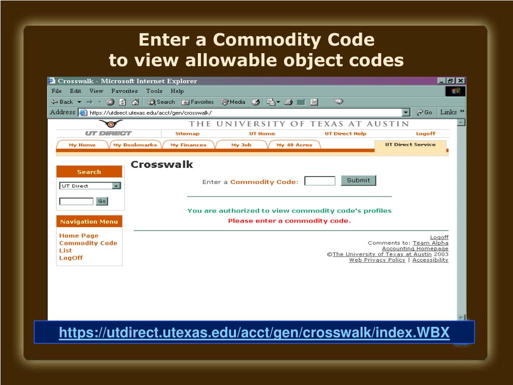 Assistance on the web • Crosswalk FAQs:http://www.utexas.edu/business/accounting/ap/vp1crosswalk-top10.html • Commodity Class Code Information: https://utdirect.utexas.edu/acct/gen/crosswalk/index.WBX