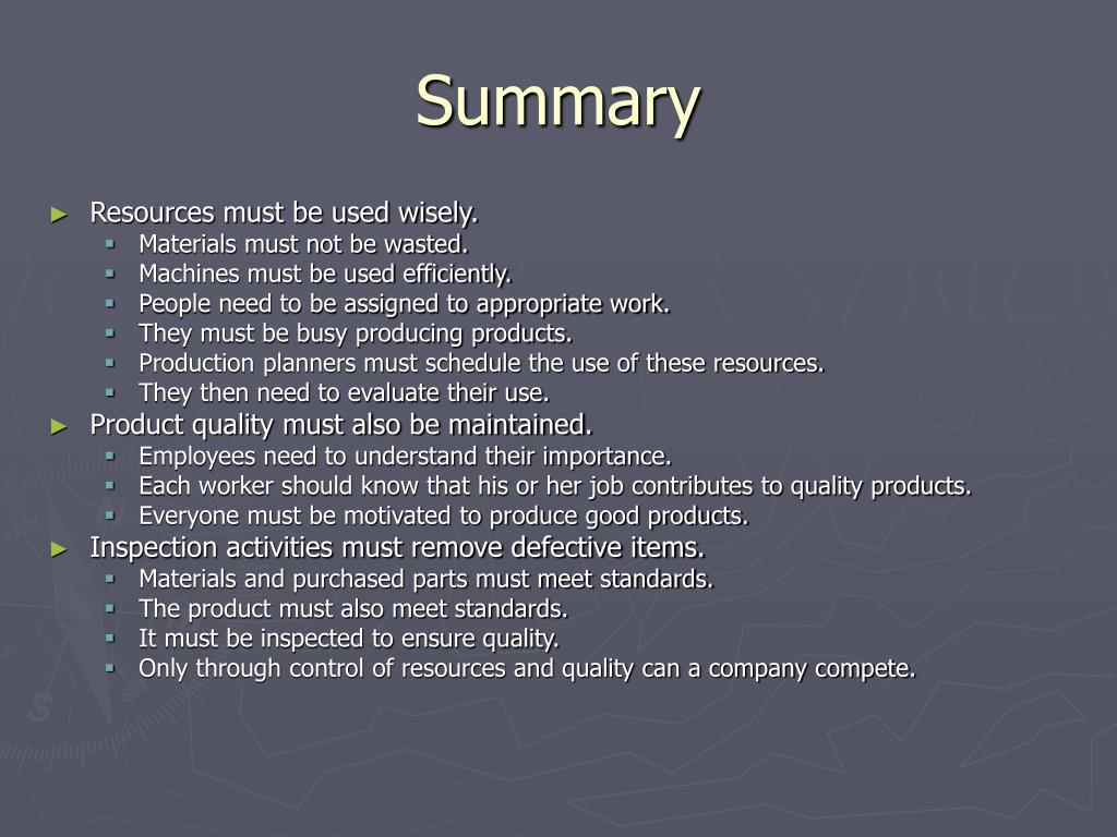 Summary • Resources must be used wisely. • Materials must not be wasted. • Machines must be used efficiently. • People need to be assigned to appropriate work. • They must be busy producing products. • Production planners must schedule the use of these resources. • They then need to evaluate their use. • Product quality must also be maintained. • Employees need to understand their importance. • Each worker should know that his or her job contributes to quality products. • Everyone must be motivated to produce good products. • Inspection activities must remove defective items. • Materials and purchased parts must meet standards. • The product must also meet standards. • It must be inspected to ensure quality. • Only through control of resources and quality can a company compete.