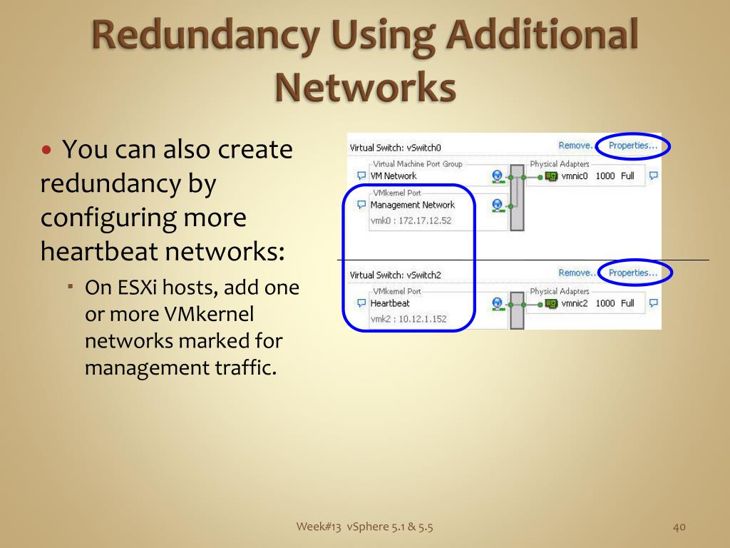 Redundancy Using Additional Networks • You can also create redundancy by configuring more heartbeat networks: • On ESXi hosts, add one or more VMkernel networks marked for management traffic. Week#13 vSphere 5.1 & 5.5