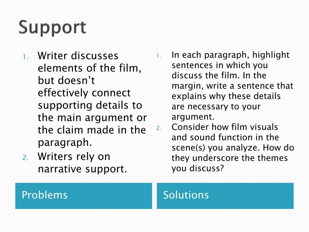 Support • Writer discusses elements of the film, but doesn’t effectively connect supporting details to the main argument or the claim made in the paragraph. • Writers rely on narrative support. • In each paragraph, highlight sentences in which you discuss the film. In the margin, write a sentence that explains why these details are necessary to your argument. • Consider how film visuals and sound function in the scene(s) you analyze. How do they underscore the themes you discuss? Problems Solutions