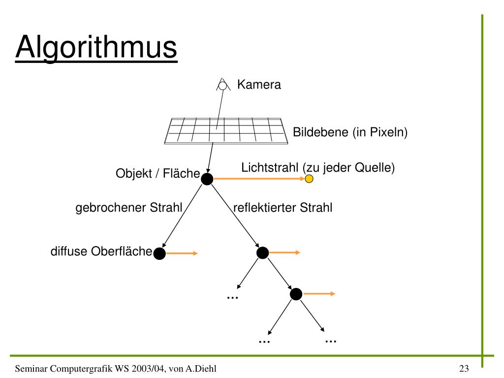 Kamera Bildebene (in Pixeln) Lichtstrahl (zu jeder Quelle) Objekt / Fläche gebrochener Strahl reflektierter Strahl diffuse Oberfläche … … … Algorithmus Seminar Computergrafik WS 2003/04, von A.Diehl