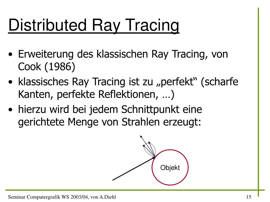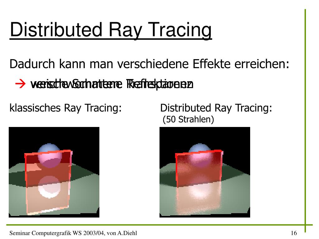 Distributed Ray Tracing: (50 Strahlen) Distributed Ray Tracing Dadurch kann man verschiedene Effekte erreichen: weiche Schatten verschwommene Reflektionen verschwommene Transparenz klassisches Ray Tracing: Seminar Computergrafik WS 2003/04, von A.Diehl