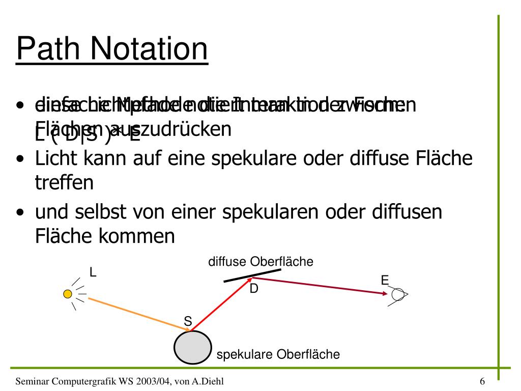 diffuse Oberfläche spekulare Oberfläche Path Notation • einfache Methode die Interaktion zwischen Flächen auszudrücken • Licht kann auf eine spekulare oder diffuse Fläche treffen • und selbst von einer spekularen oder diffusen Fläche kommen • diese Lichtpfade notiert man in der Form: L ( D|S )* E L E D S Seminar Computergrafik WS 2003/04, von A.Diehl