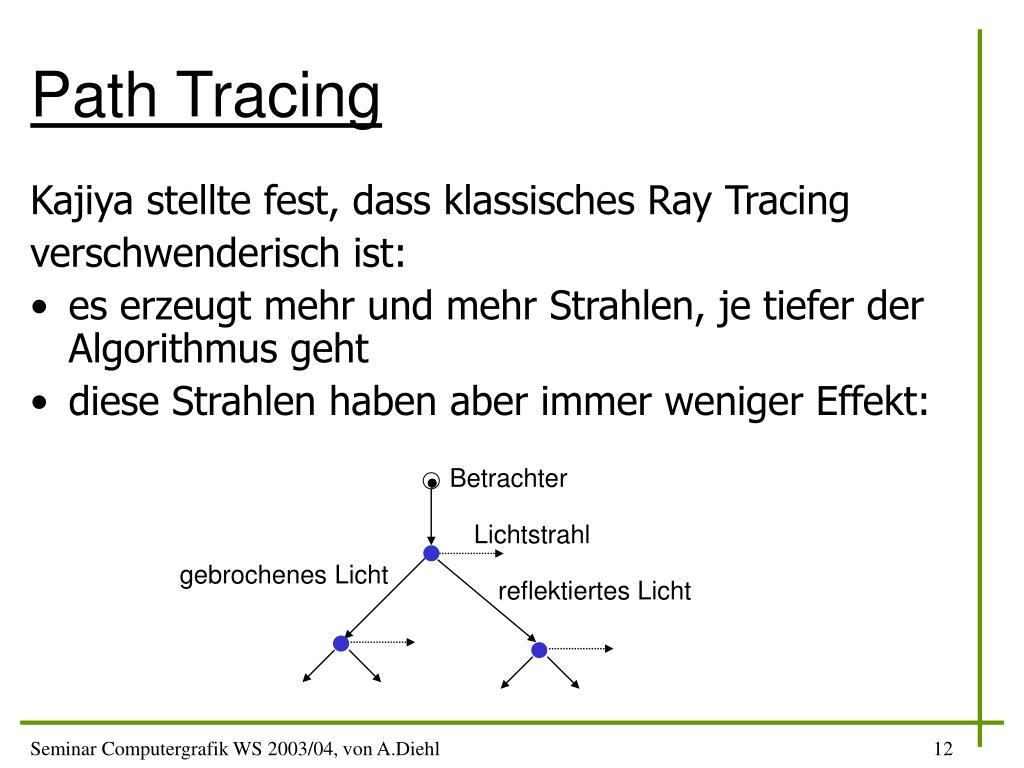 Betrachter Lichtstrahl gebrochenes Licht reflektiertes Licht Path Tracing Kajiya stellte fest, dass klassisches Ray Tracing verschwenderisch ist: • es erzeugt mehr und mehr Strahlen, je tiefer der Algorithmus geht • diese Strahlen haben aber immer weniger Effekt: Seminar Computergrafik WS 2003/04, von A.Diehl