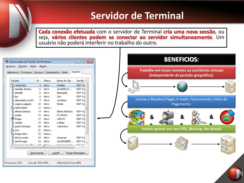 Servidor de Terminal Características Cada conexão efetuadacom o servidor de Terminal cria uma nova sessão, ou seja, vários clientes podem se conectar ao servidor simultaneamente. Um usuário não poderá interferir no trabalho do outro. BENEFICIOS: Trabalhe em locais remotos ou escritórios virtuais (independente da posição geográfica); Contas a Receber/Pagar, E-mails, Faturamento, Folha de Pagamento. & & & & & & Invista apenas em seu CPD, (Backup, No-Break)