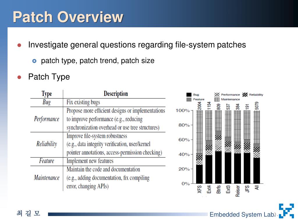 Patch Overview • Investigate general questions regarding file-system patches • patch type, patch trend, patch size • Patch Type