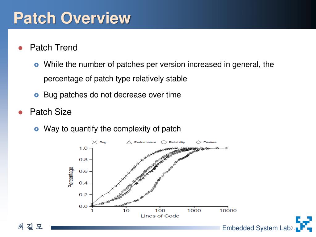 Patch Overview • Patch Trend • While the number of patches per version increased in general, the percentage of patch type relatively stable • Bug patches do not decrease over time • Patch Size • Way to quantify the complexity of patch